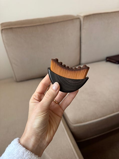 My MVP of the week, reminded about by Liana Satenstein’s story, is the Lymphatic Brush by Cecily Braden. A curved brush made up of millions of soft bristles topped off in a “button” pattern that promotes blood flow and moves stagnant fluid around your face. You might’ve seen the millions of Temu knockoffs, but I hear from the most credible sources (authorized seller Raquel Medina) to accept to imitators. I used it on the plane, driving through wine country, and every morning at the hotel to offset the jet lag, travel, and the effects of wine consumption during these inflammatory days.