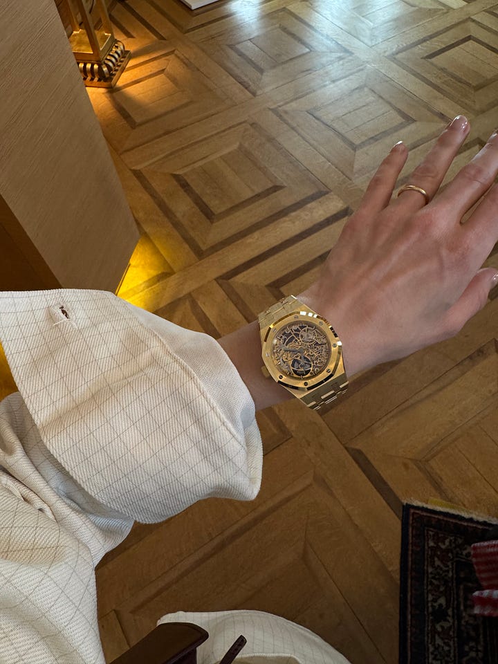 The most expensive thing I tried on, at a security-heavy workshop hosted by the brand, was an Audemars Piguet Royal Oak Double Balance Wheel Openworked, “openworked” meaning you can see the mechanics of that fames Swiss precision in action directly by glancing at the dial. Am I selling myself as a watch person? It’s $103,000, so if I am, maybe not today.