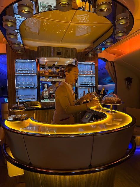 12p Laura lands — in an out of character flourish, I flew Emirates business here, which meant my design week started at the on-deck bar; mid-air cocktails and running into Jolie’s Arjan Singh and meeting HLW’s Currie Gardner—a preamble of schmoozing in the skies - LR