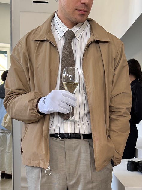 5p Apartamento x Jil Sander “Reference Library” cocktail — a glittering grid of steel podiums, each featuring a book curated by a tastemaker in the brands’ orbits; guests (we) had to (got to) wear little white archivist gloves bearing the respective logos (wonder how soon these will surface on resale sites) - LR + XD