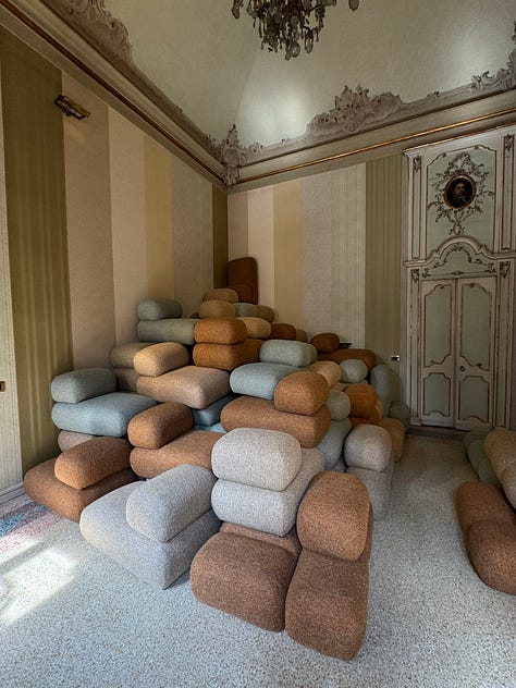 2:30p Kelly Wearstler x H&M Home preview — launching September 3, with modular pieces like a Mario Bellini-inspired armchair / sofa system at an ostensibly much lower price. The Zara Home-ification of H&M. - LR