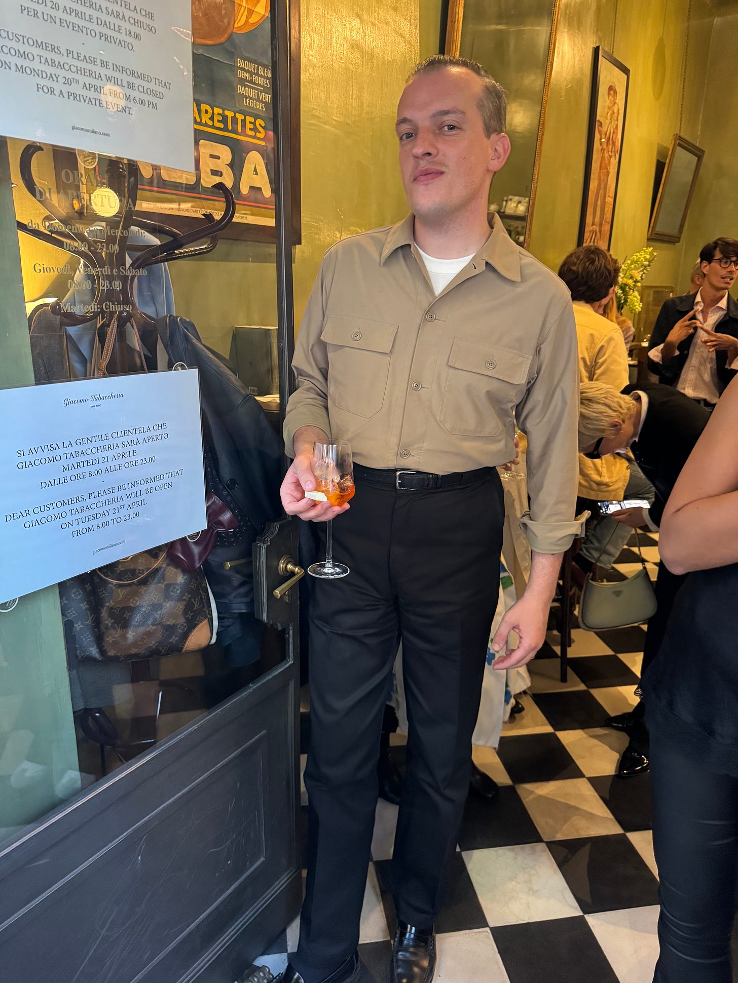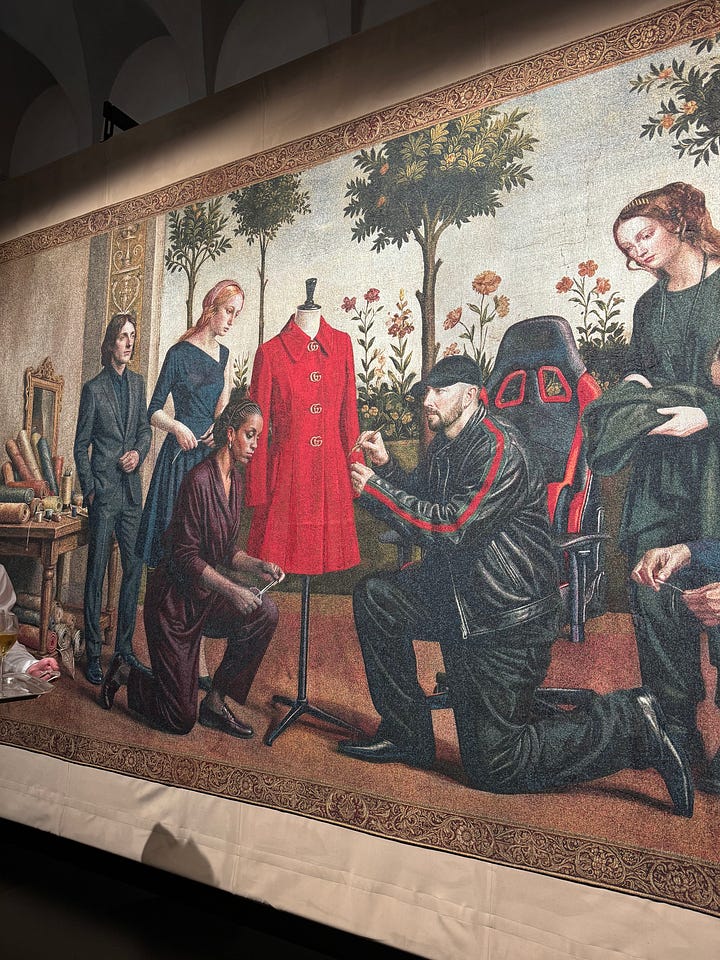 8:30p Gucci Memoria cocktail — Demna made an appearance, both in person and woven into the chronically online tapestries created for the event featuring Bamboo Bags and Jackies in Renaissance-styled scenes that hung on the walls of the impressive Chiostri di San Simpliciano. - LR