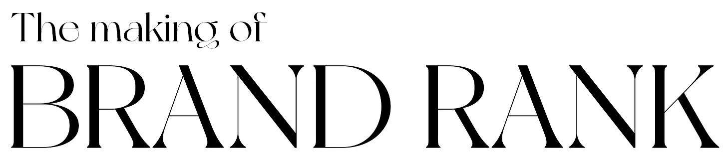 If you have any questions or ideas about the way we compile Brand Rank, or you’re curious to hear how a seafood tower is somehow involved in its making (it is), we’d love to hear from you. Email me directly at laura@magasin.ltd to share your thoughts.